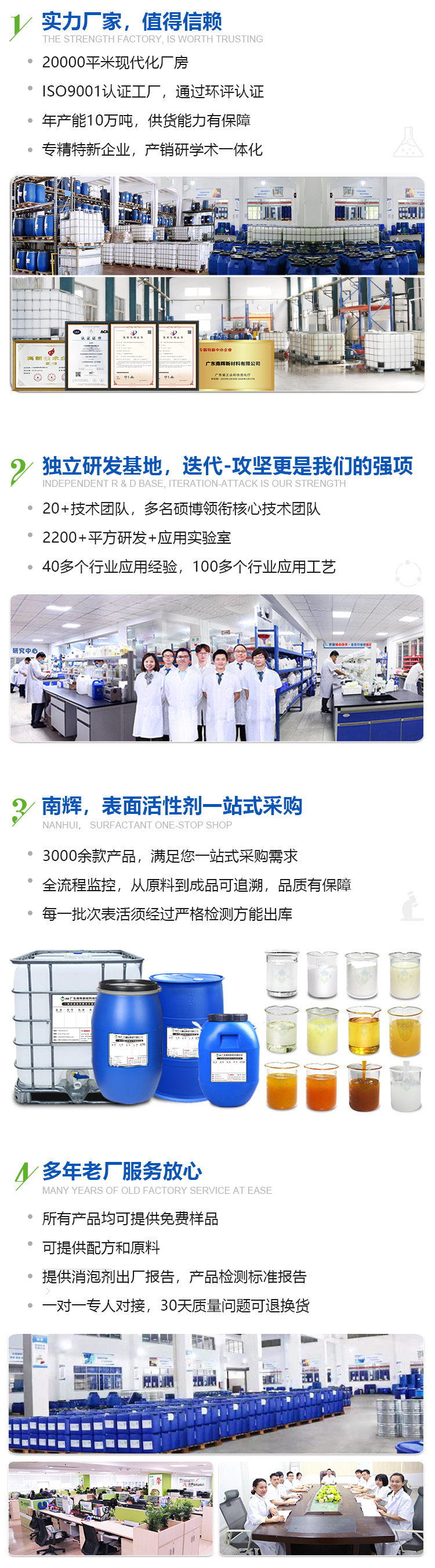 • 廣東南輝新材料有限公司,是一家致力于表面活性劑研發(fā)、生產(chǎn)、銷售為一體的國家高新技術(shù)企業(yè),擁有獨(dú)立的研發(fā)基地,主要研發(fā)產(chǎn)品有:乳化劑、滲透劑、勻染劑、司盤、吐溫、消泡劑等3000余款產(chǎn)品。南輝擁有20000平方米的現(xiàn)代化生產(chǎn)車間,年產(chǎn)能可達(dá)10萬噸。通過ISO9001:2015質(zhì)量管理體系認(rèn)證,已獲得十余項(xiàng)不同產(chǎn)品的發(fā)明專利授權(quán),被評為廣東省"專精特新"企業(yè)。從2018年開始批量出口至俄羅斯、日本、馬來西亞、印度、秘魯?shù)葒遥殉蔀閲鴥?nèi)目前主要的表面活性劑生產(chǎn)廠家。